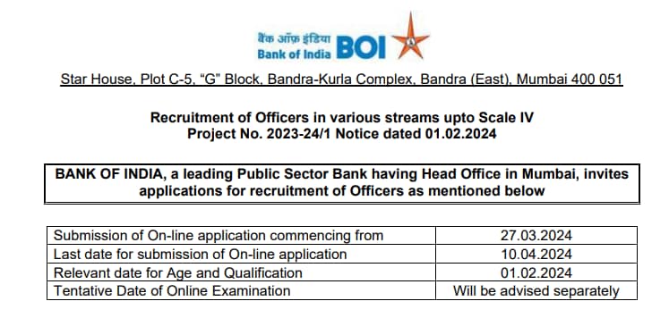 Notification issued for Bank of India Officer Recruitment 2024 for various posts at bankofindia.co.in. Apply online for 143 vacancies. Last Date to Apply Online is 10th April 2024