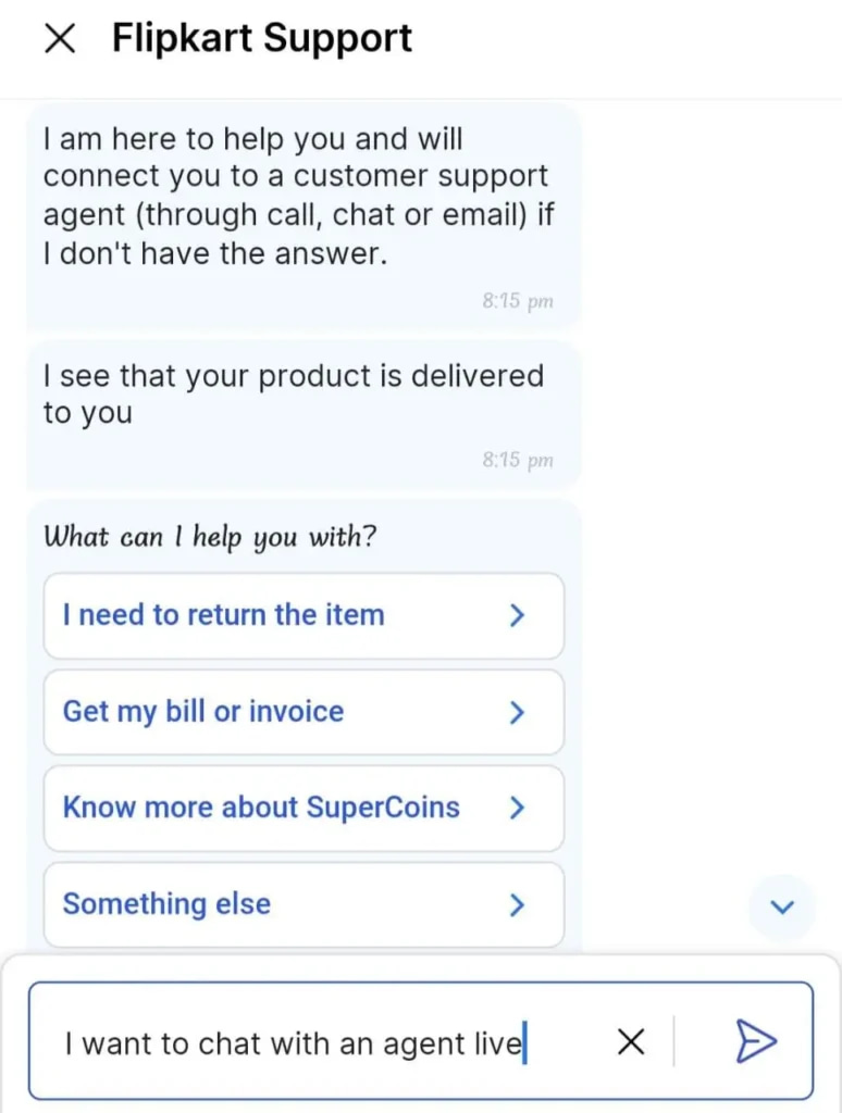 Ans: Use the help center in the Flipkart app or website, where you can find contact options such as chat support, a helpline number, or a contact form.