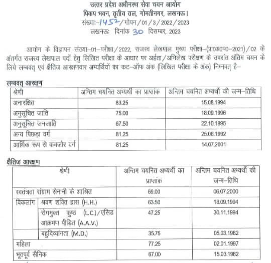 Along with the UP Lekhpal Final Result 2023, the UPSSSC has also released the UP Lekhpal Cut Off 2023 marks for various categories. The cut-off marks are the minimum scores that candidates need to secure in order to qualify for the next round of the selection process. Here are the category-wise cut-off marks for UP Lekhpal 2023: